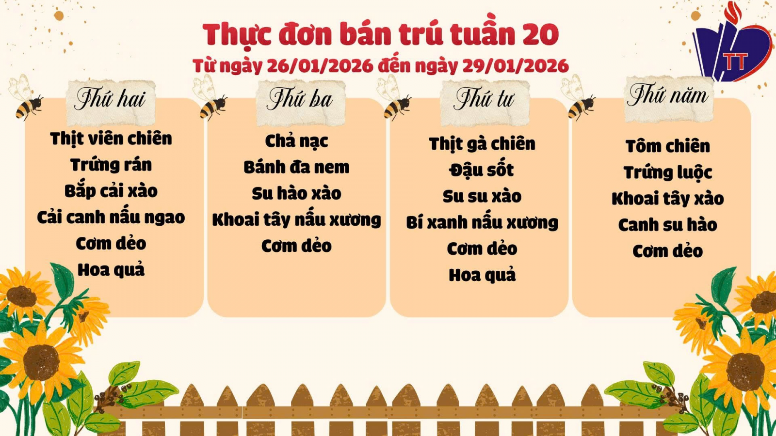 THỰC ĐƠN BÁN TRÚ TUẦN 19(19/01/2026)