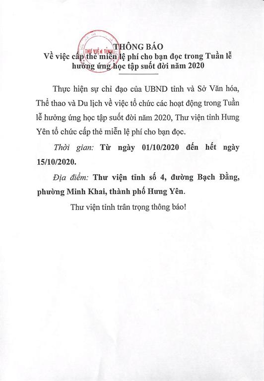 Thông báo về việc cấp thẻ miễn lệ phí cho bạn đọc trong Tuần lễ hưởng ứng họp tập suốt đời năm 2020