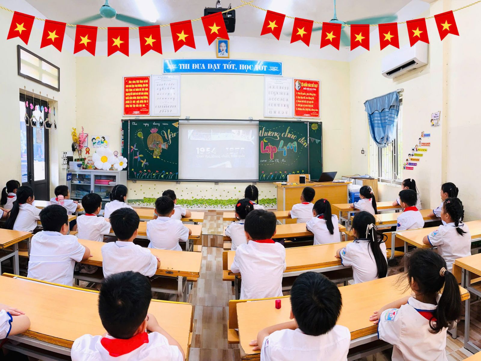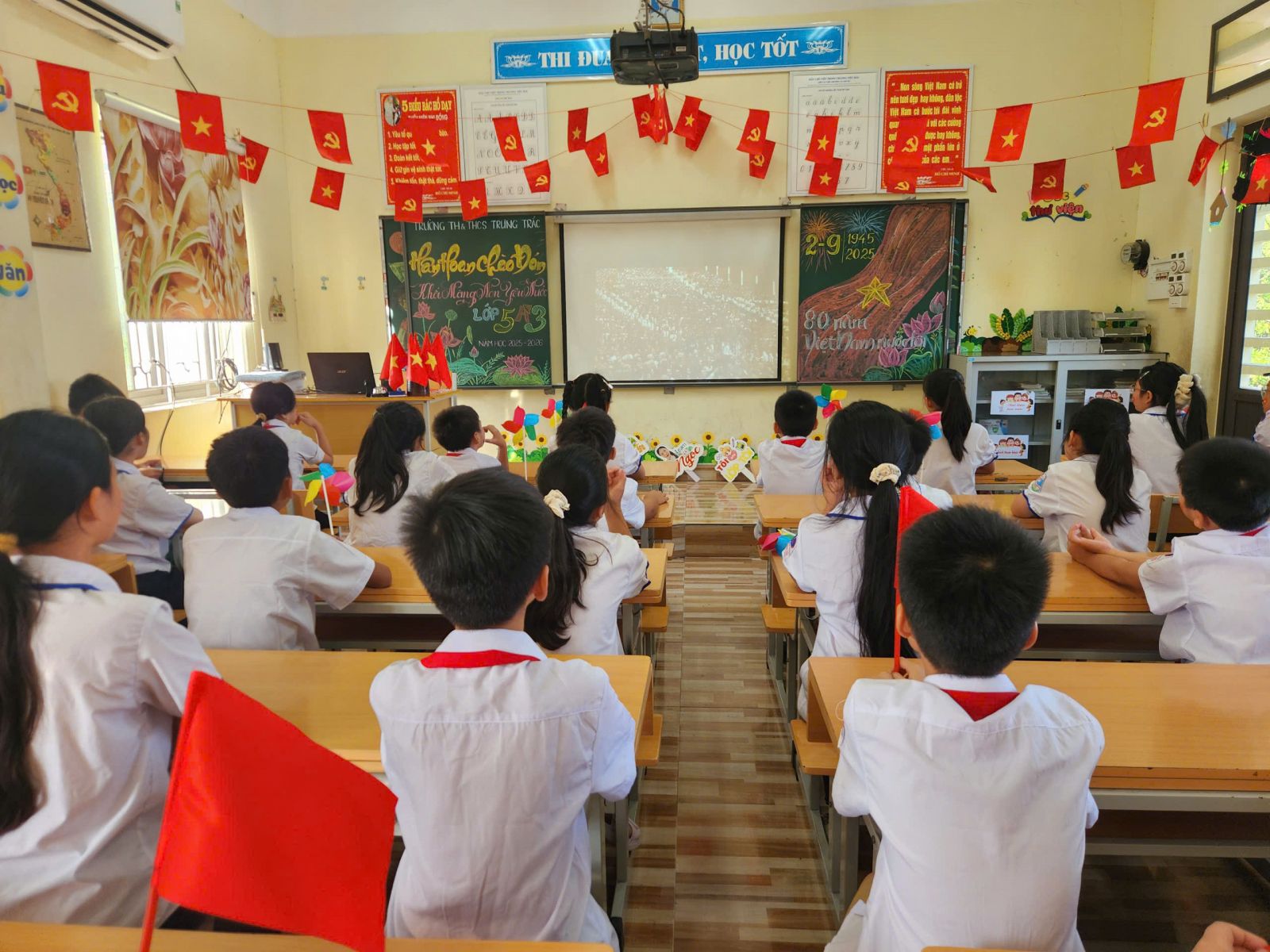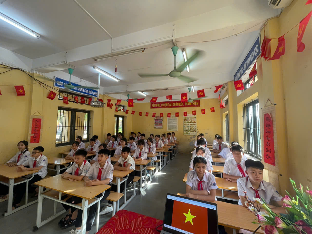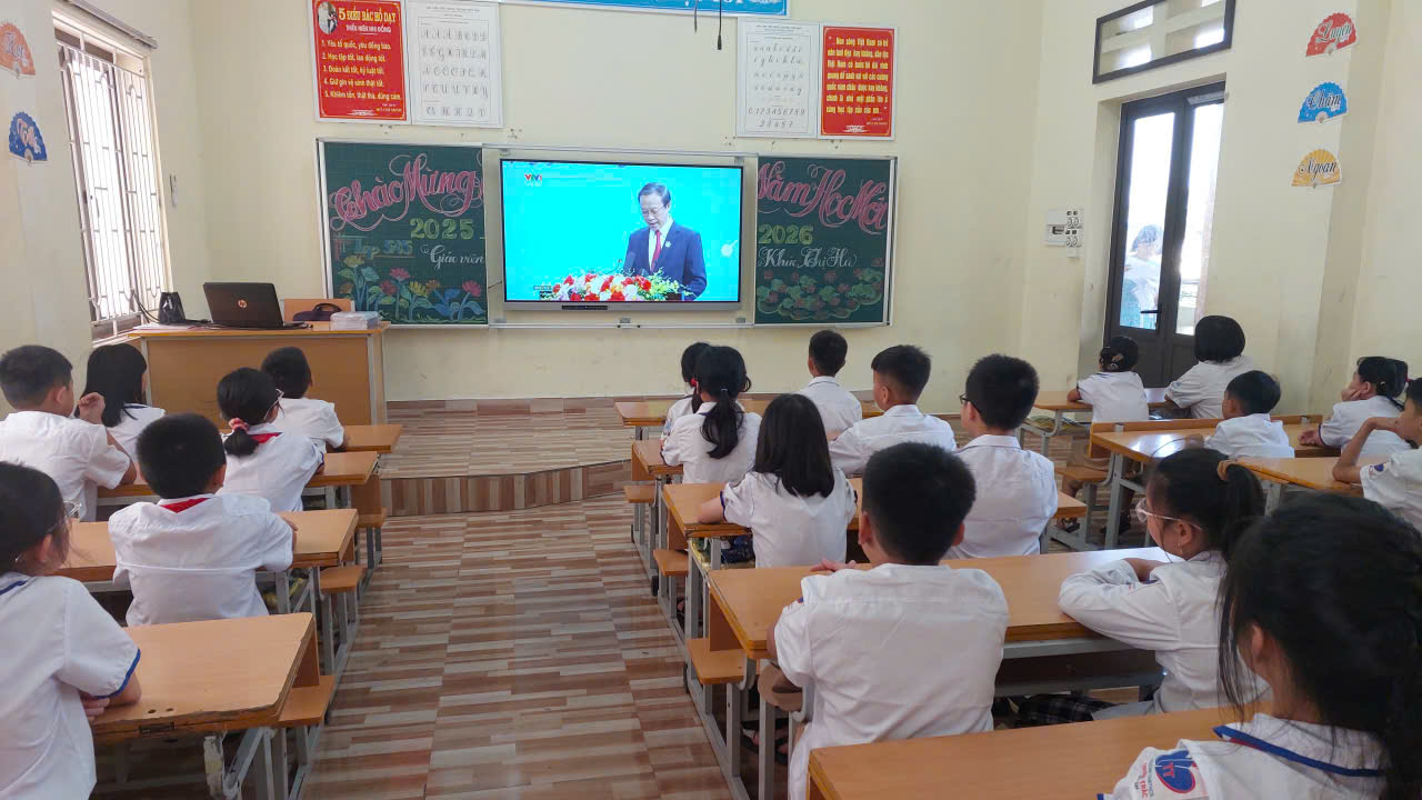 Điểm nhấn đặc biệt của Lễ Khai giảng năm nay: Lần đầu tiên trong lịch sử, lễ khai giảng được tổ chức đồng loạt trên toàn quốc, cùng một thời điểm, từ mầm non đến đại học – tạo nên dấu mốc giàu ý nghĩa. Tại hội trường, Ban lãnh đạo và các đại biểu trang nghiêm theo dõi chương trình trực tiếp từ Trung tâm Hội nghị Quốc gia. Các em học sinh tham dự lễ ngay tại lớp học của mình – nơi được trang trí rực rỡ, ấm áp, để mỗi lớp học trở thành một “sân khấu khai giảng” đầy sắc màu và niềm vui.