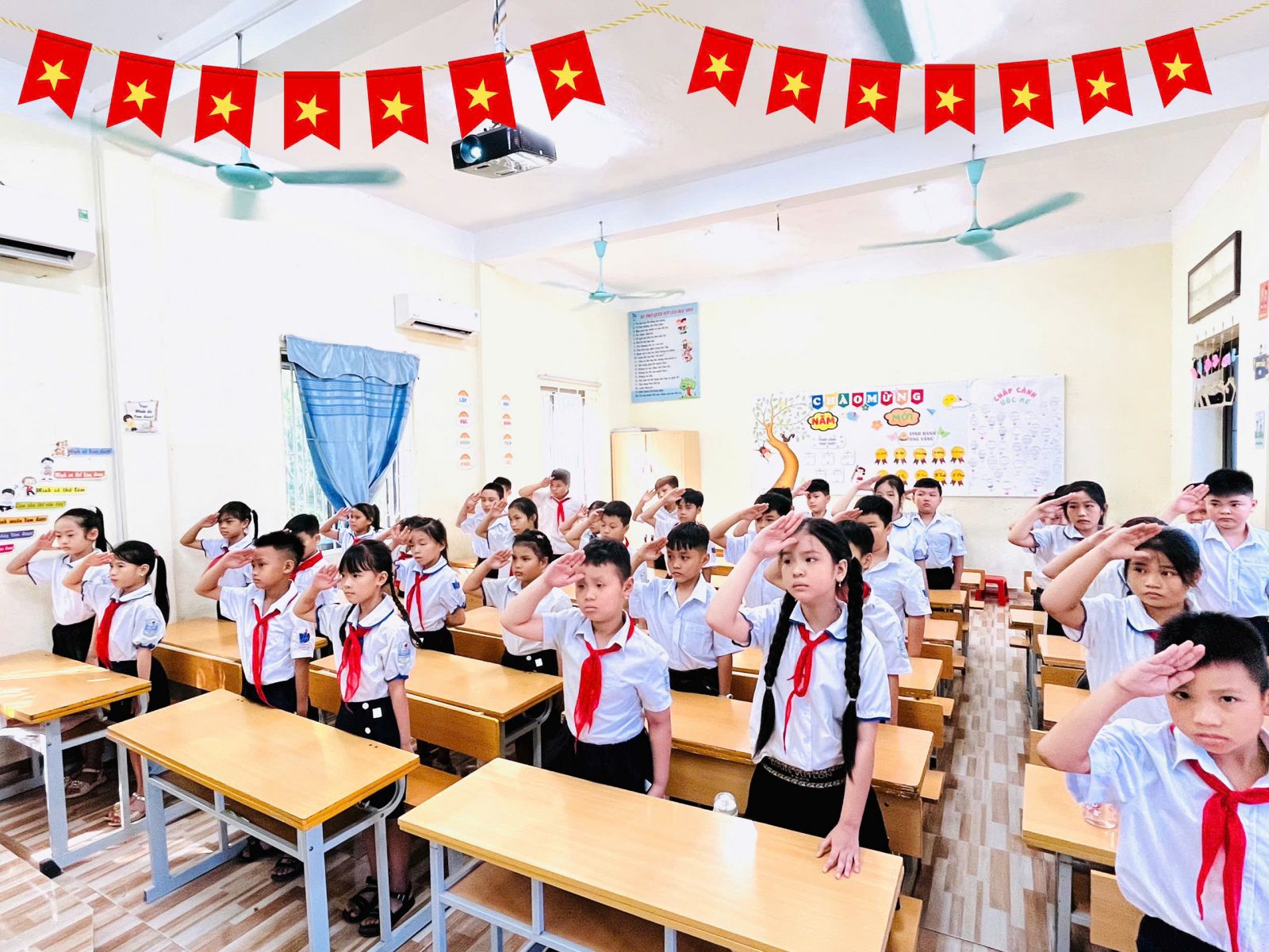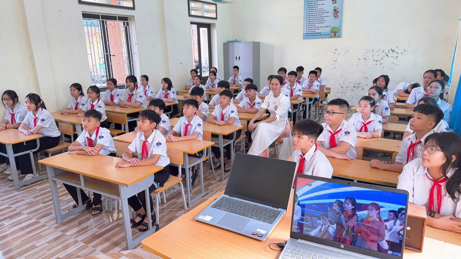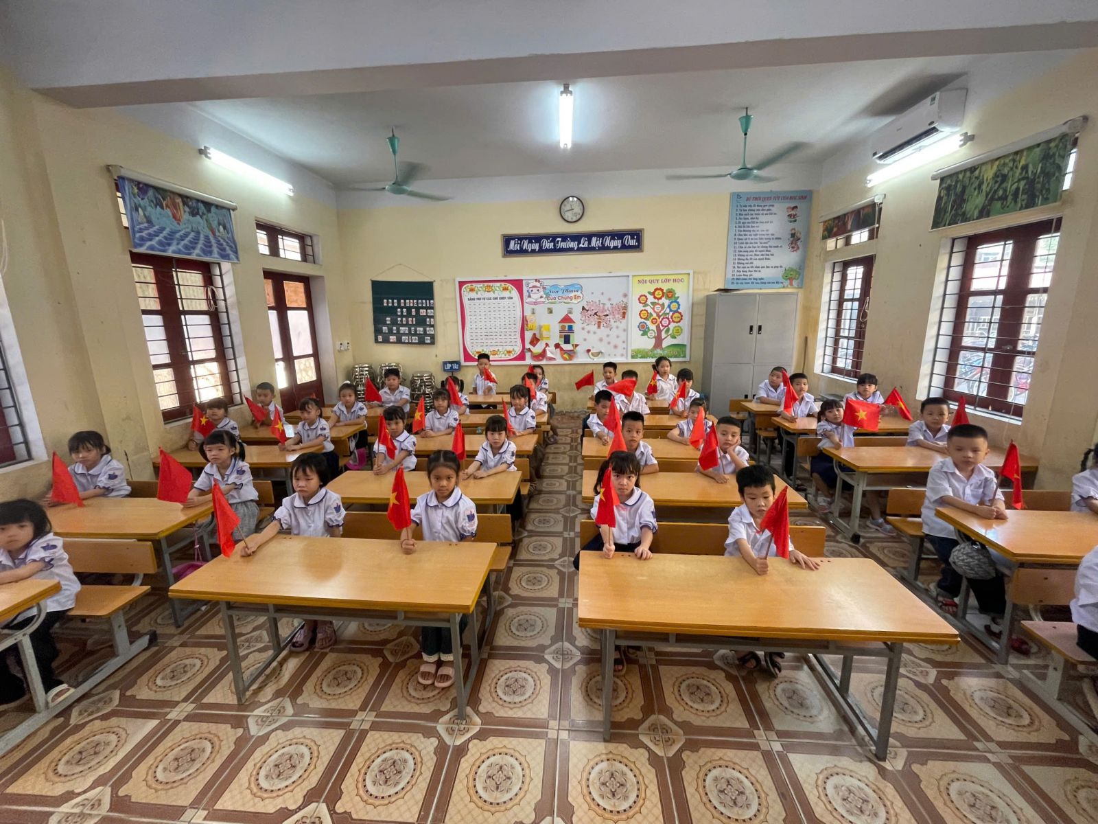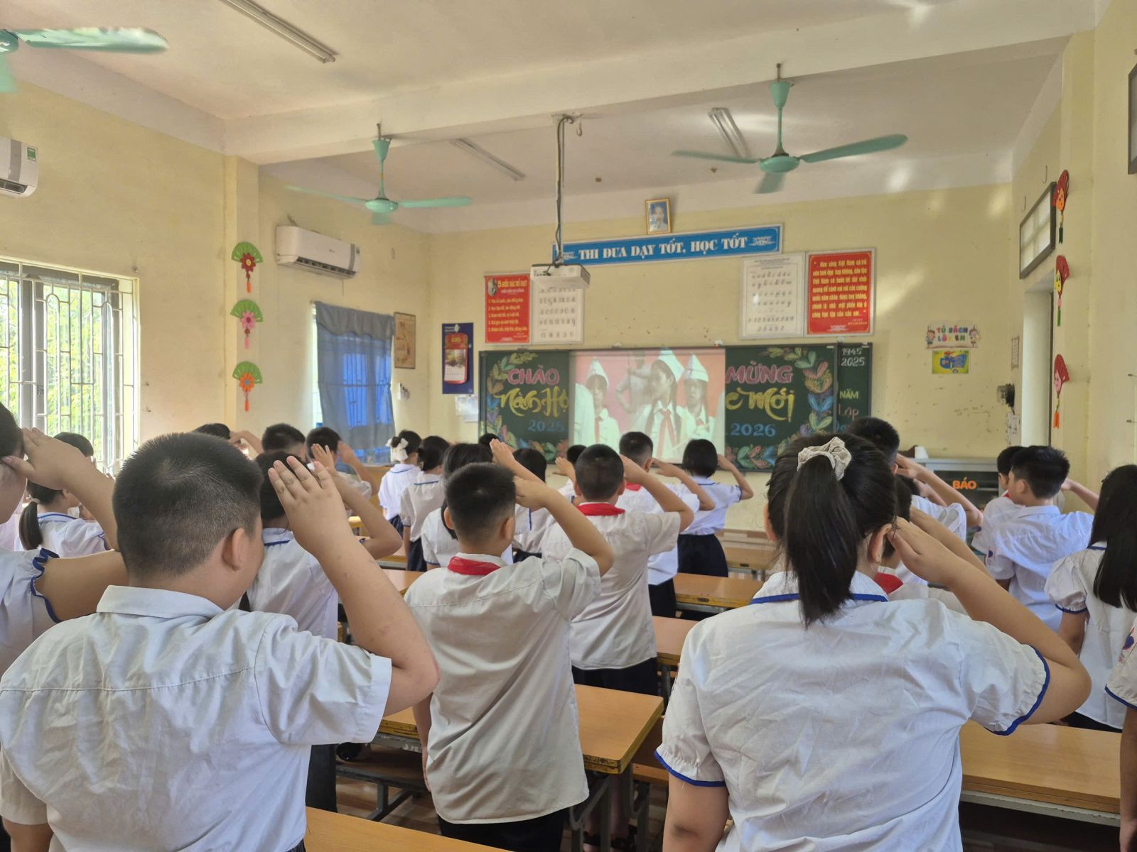 Điểm nhấn đặc biệt của Lễ Khai giảng năm nay: Lần đầu tiên trong lịch sử, lễ khai giảng được tổ chức đồng loạt trên toàn quốc, cùng một thời điểm, từ mầm non đến đại học – tạo nên dấu mốc giàu ý nghĩa. Tại hội trường, Ban lãnh đạo và các đại biểu trang nghiêm theo dõi chương trình trực tiếp từ Trung tâm Hội nghị Quốc gia. Các em học sinh tham dự lễ ngay tại lớp học của mình – nơi được trang trí rực rỡ, ấm áp, để mỗi lớp học trở thành một “sân khấu khai giảng” đầy sắc màu và niềm vui.