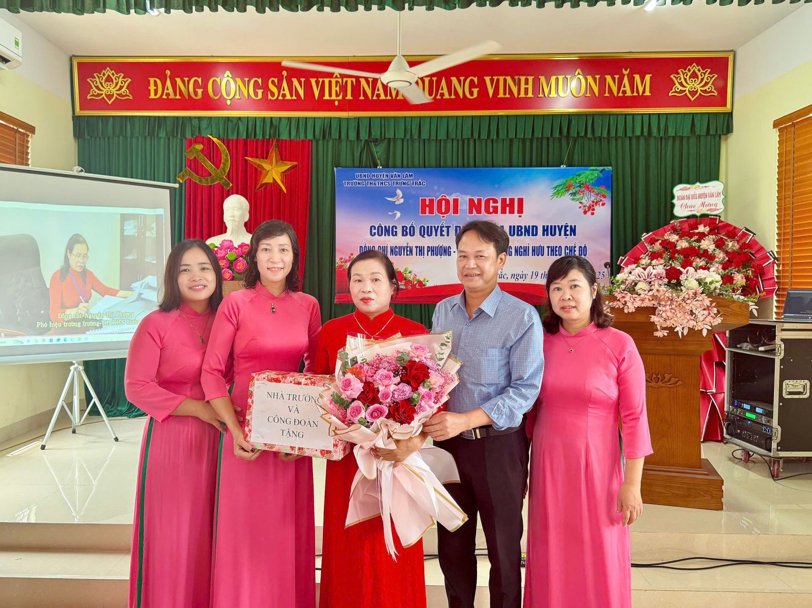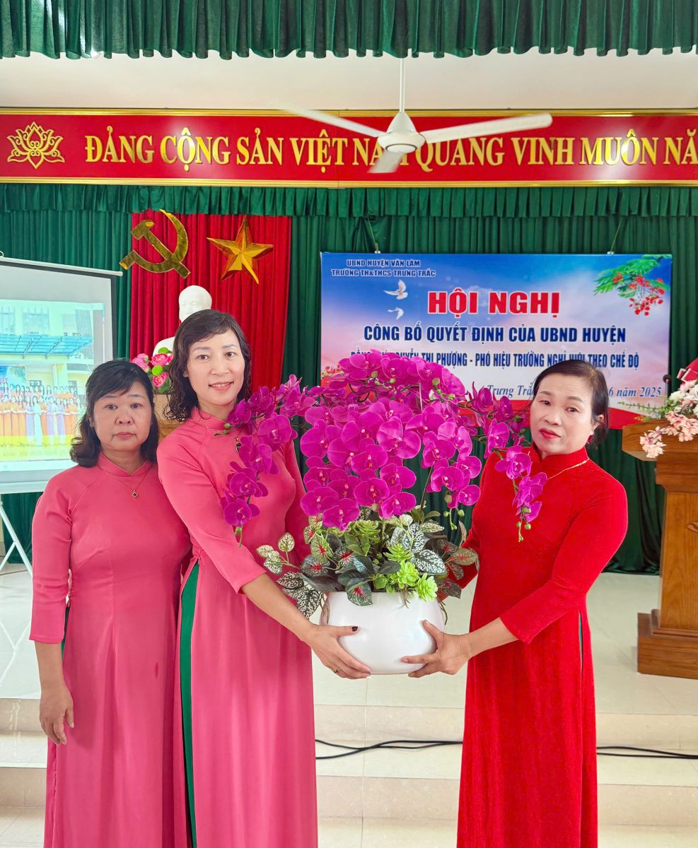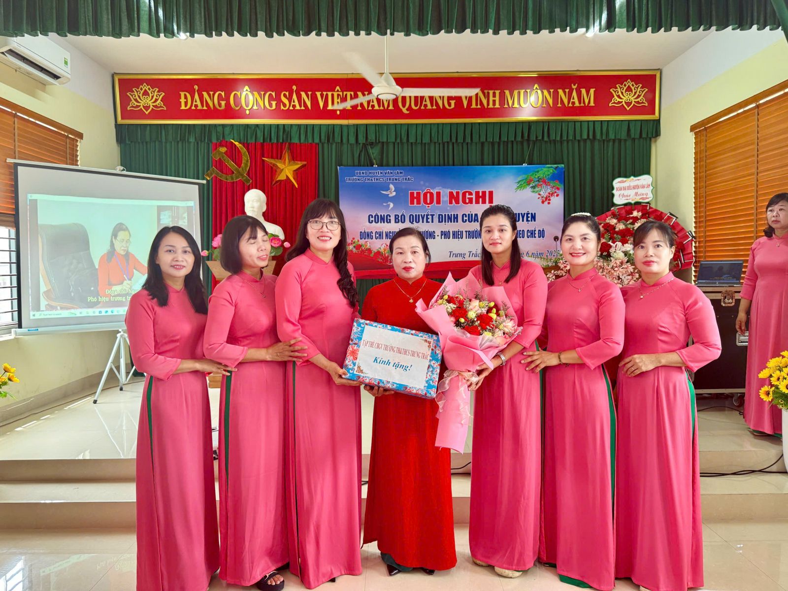 Trong cuộc đời mỗi con người ai cũng phải trải qua thời gian học tập, đi làm và rồi thay đổi nơi công tác, giữ các chức vụ khác nhau, Biết bao gắn bó và có nhiều kỉ niệm tốt đẹp không thể nào quên. Với 35 năm 10 tháng trong nghề dạy học trồng người, 32 năm 10 tháng công tác tại trường và 19 năm 3 tháng với cương vị là phó Hiệu trưởng nhà trường. Đ/c đã cùng với các thầy, cô giáo trong BGH nhà trường, tập thể HĐSP nhà trường tận tâm tận tuỵ hoàn thành tốt nhiệm vụ vẻ vang của mình, góp phần cùng với nhà trường thực hiện thắng lợi nhiệm vụ qua các năm học, đưa thành tích của nhà trường ngày một đi lên. Với sự nỗ lực phấn đấu, sự cống hiến về trí tuệ, về sức khoẻ cho sự nghiệp trồng người, hôm nay đ/c được Đảng và nhà nước cho về nghỉ chế độ. Để ghi nhận công lao đóng góp của đ/c trong thời gian công tác tại trường đồng thời để lưu giữ lại những kỷ niệm tốt đẹp nhất với các đồng nghiệp, học sinh của mình trong môi trường sư phạm này. Hôm nay Trường TH&THCS Trưng Trắc tổ chức Hội nghị công bố quyết định của Chủ tịch UBND huyện cho đồng chí Nguyễn Thị Phượng - phó hiệu trưởng Trường TH&THCS Trưng Trắc nghỉ theo chế độ.
